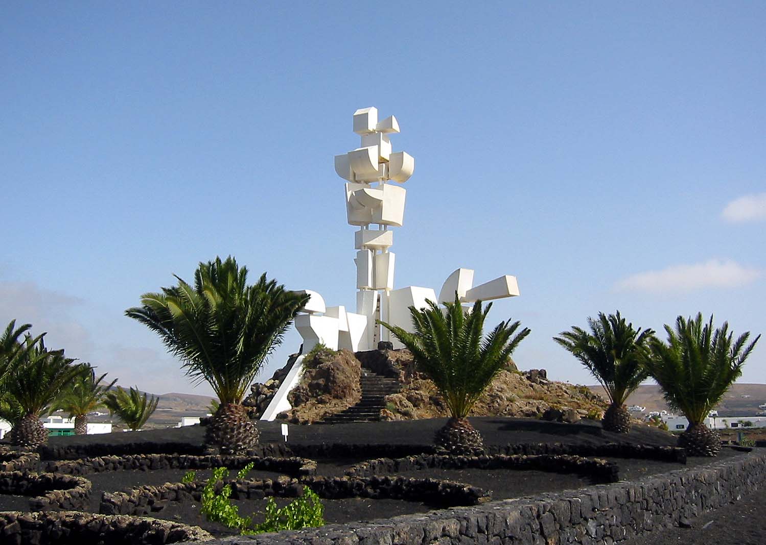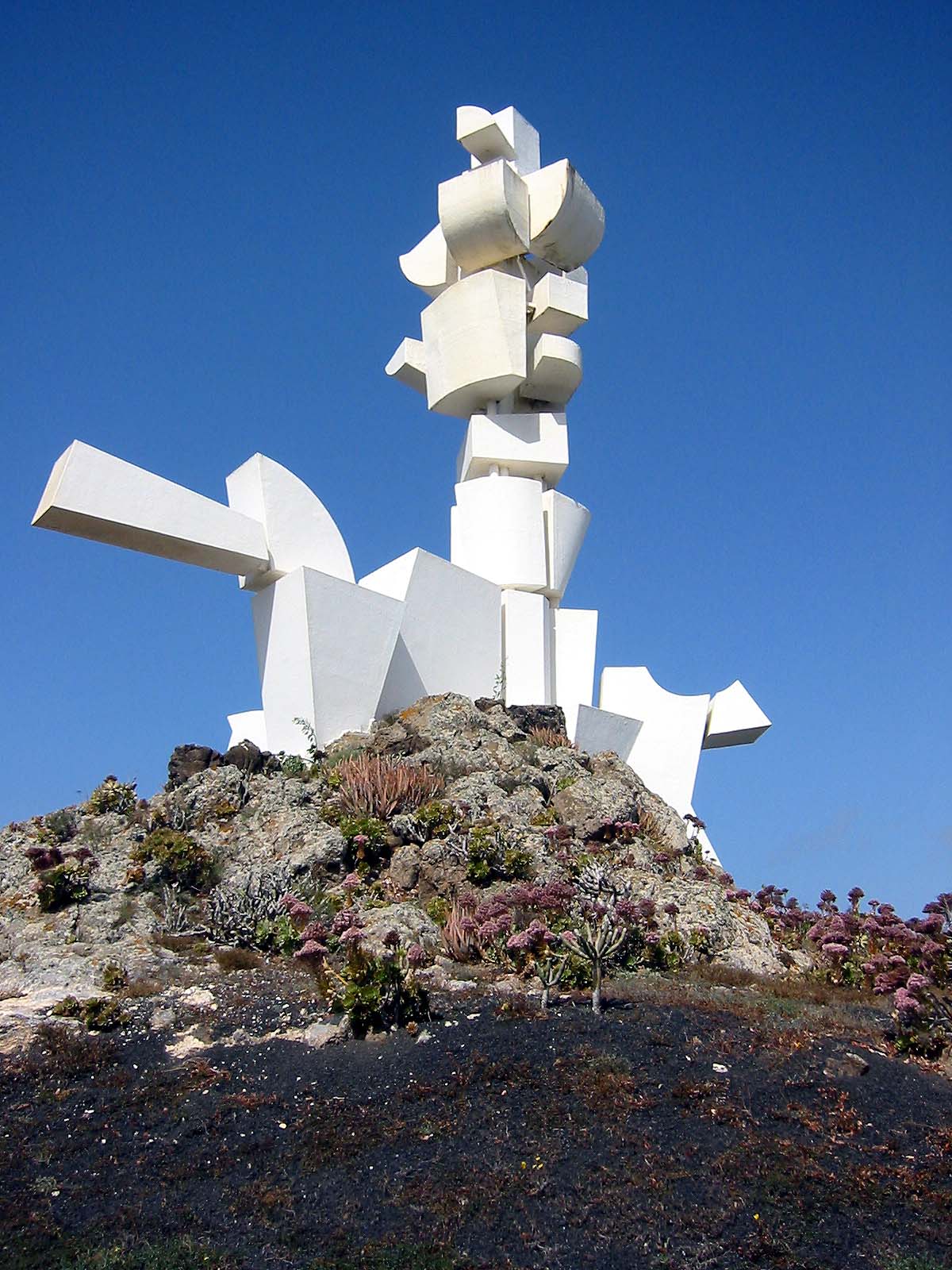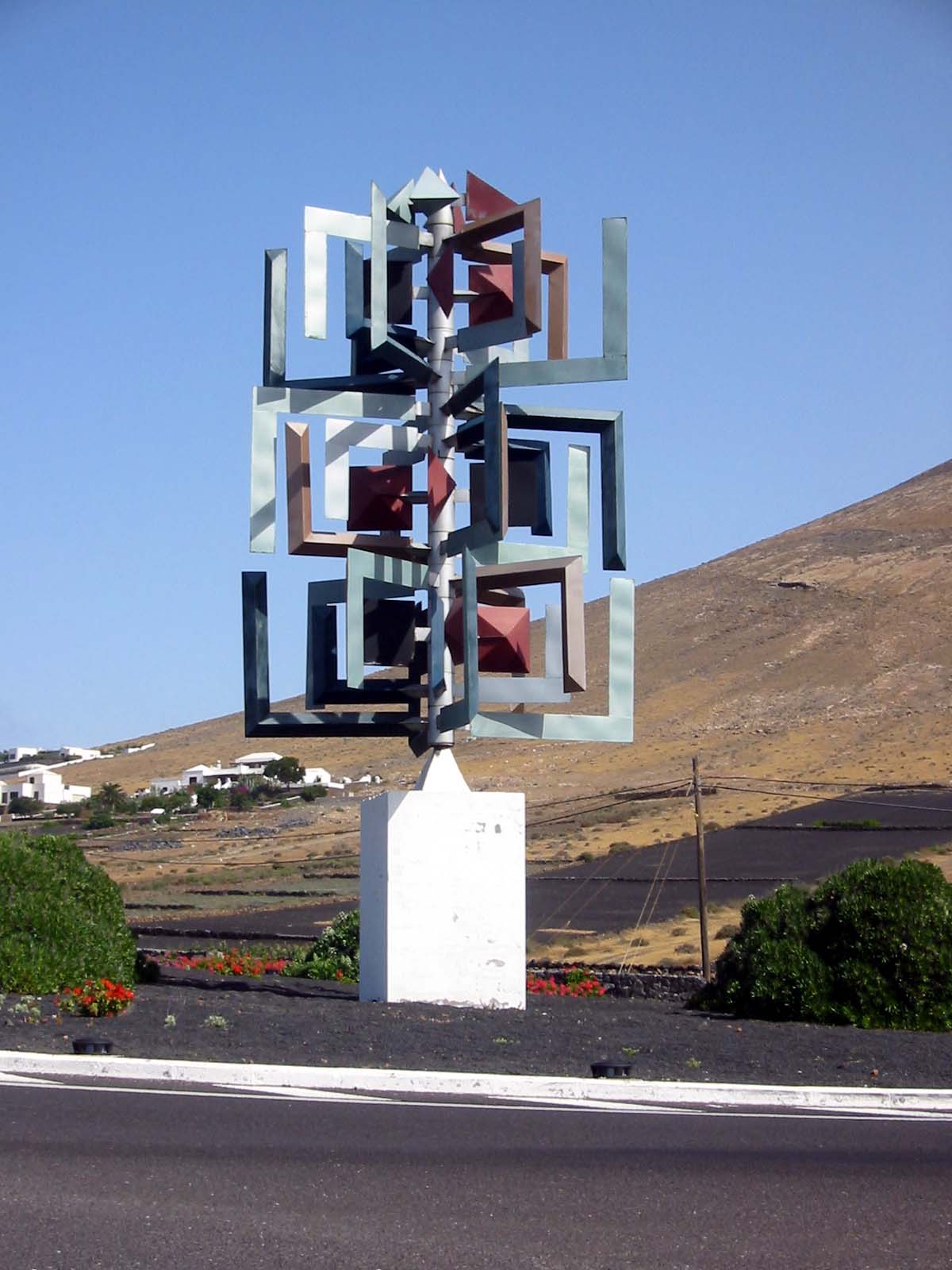 Das Museum und die Häuser umgeben genau im geographischen Mittelpunkt das 15m hohe Wahrzeichen Lanzarotes, das Monumento al Campesino