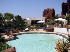 Eine weiße Poolanlage, umgeben vom idyllischen Grillplatz, bildet den Höhepunkt der Unterwelt, leise meditative Musik begleitet den Besucher