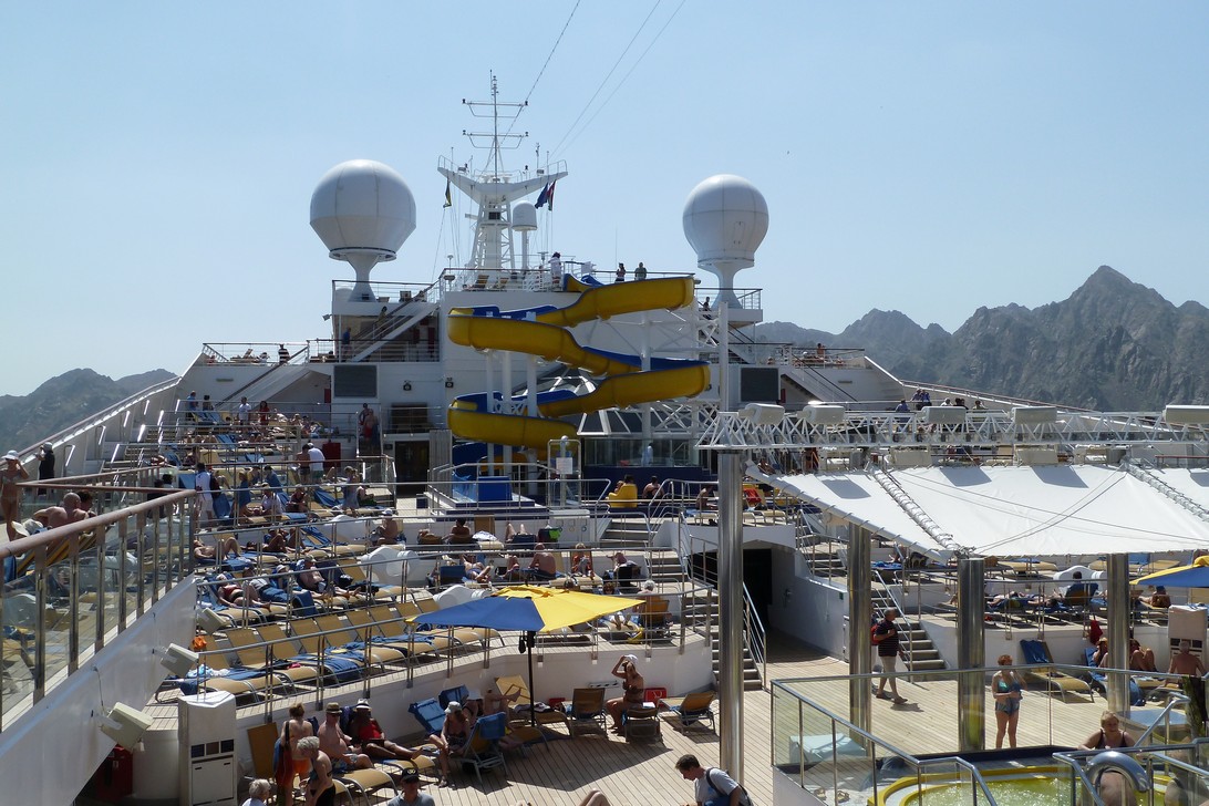 Unser Kreuzfahrtschiff, diesmal die Costa Fortuna, hat eine Länge von 273m und eine Breite von 36m. Sie besteht aus 17 Decks, davon sind 13 Gästedecks, und fährt maximal 24 Knoten. drei große Bordrestaurants versorgen 3000 Passagiere. 11 Bars mit Livemusik, sowie Casino, Theater, Internetcafé und 1.300 qm Fitnessbereich lassen keine Langeweile aufkommen.