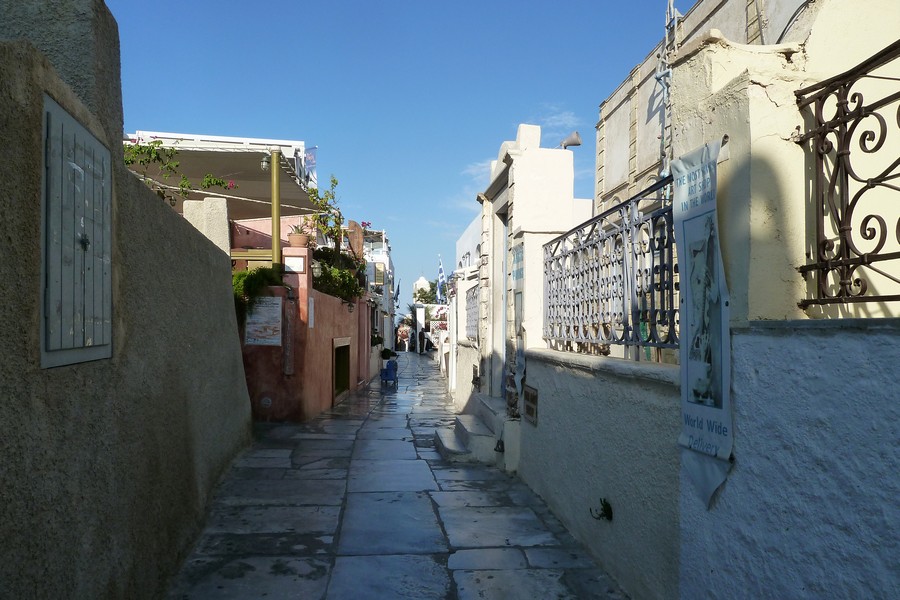 Wir sind glücklicherweise wieder die ersten, die mit dem Bus in Oía ankommen. Die Gassen sind noch leer, die Geschäfte werden gerade aufgesperrt, bevor der große Rummel losgeht. Ein kleiner Nachtel besteht, die Sonne steht noch tief, deswegen können wir erst mal nur in Richtung Westen fotografieren. Gebäude und Landschaft sind immer wieder faszinierend.