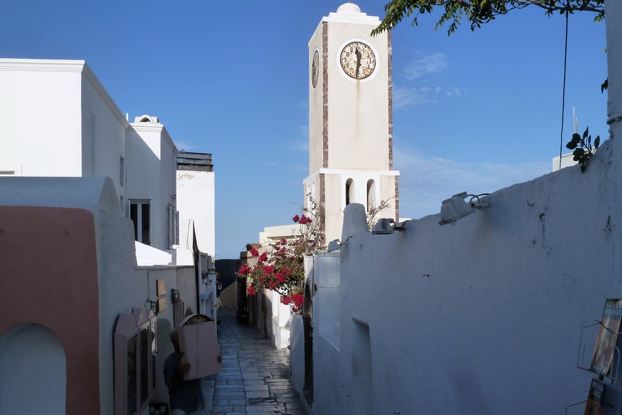 Wir sind glücklicherweise wieder die ersten, die mit dem Bus in Oía ankommen. Die Gassen sind noch leer, die Geschäfte werden gerade aufgesperrt, bevor der große Rummel losgeht. Ein kleiner Nachtel besteht, die Sonne steht noch tief, deswegen können wir erst mal nur in Richtung Westen fotografieren. Gebäude und Landschaft sind immer wieder faszinierend.