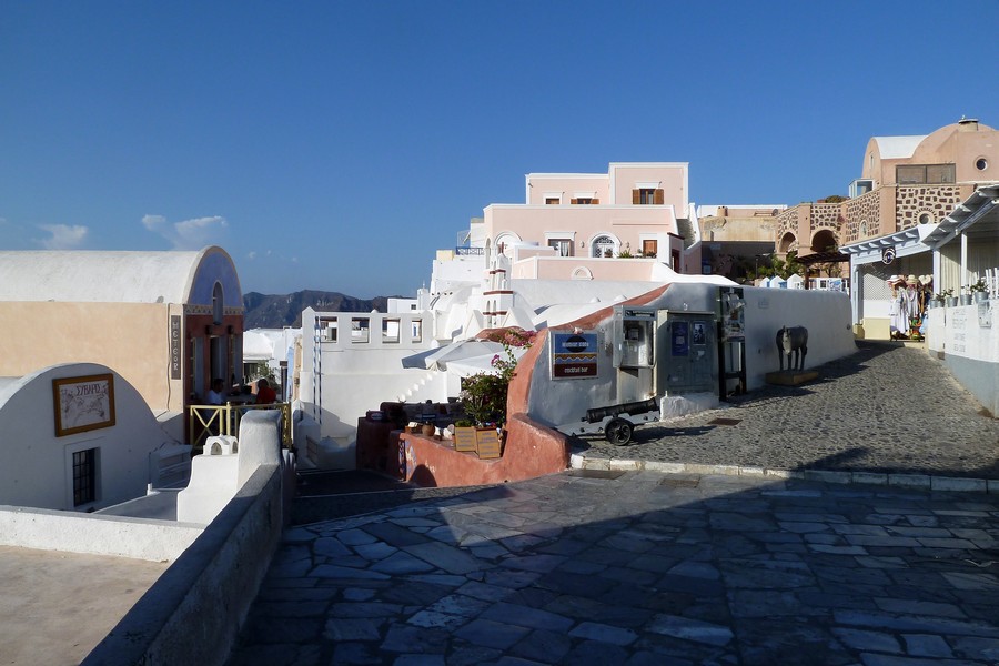 Wir sind glücklicherweise wieder die ersten, die mit dem Bus in Oía ankommen. Die Gassen sind noch leer, die Geschäfte werden gerade aufgesperrt, bevor der große Rummel losgeht. Ein kleiner Nachtel besteht, die Sonne steht noch tief, deswegen können wir erst mal nur in Richtung Westen fotografieren. Gebäude und Landschaft sind immer wieder faszinierend.