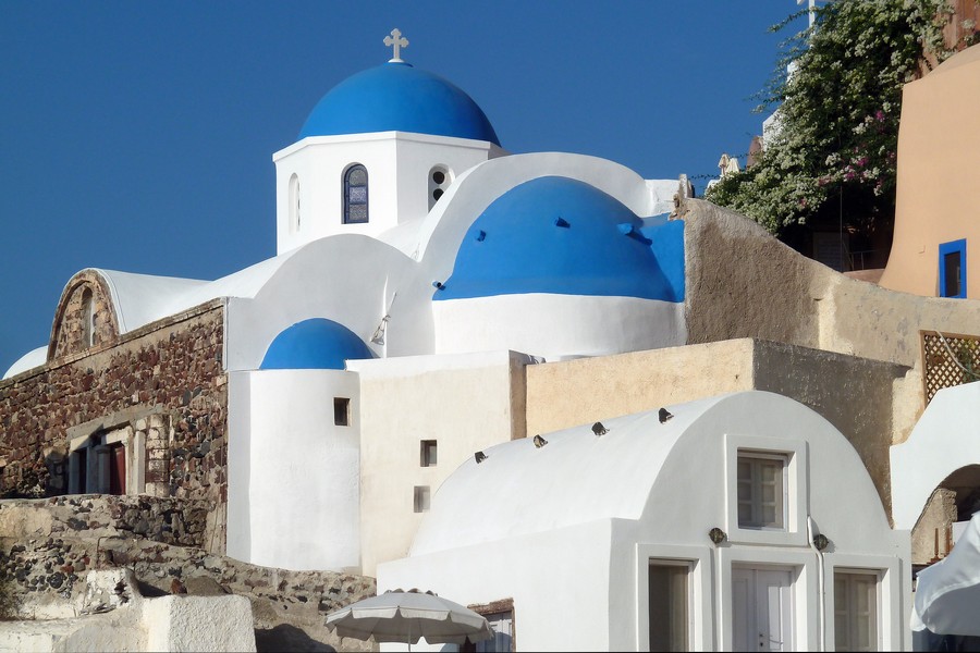 Wir sind glücklicherweise wieder die ersten, die mit dem Bus in Oía ankommen. Die Gassen sind noch leer, die Geschäfte werden gerade aufgesperrt, bevor der große Rummel losgeht. Ein kleiner Nachtel besteht, die Sonne steht noch tief, deswegen können wir erst mal nur in Richtung Westen fotografieren. Gebäude und Landschaft sind immer wieder faszinierend.