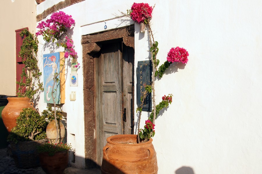 Wir sind glücklicherweise wieder die ersten, die mit dem Bus in Oía ankommen. Die Gassen sind noch leer, die Geschäfte werden gerade aufgesperrt, bevor der große Rummel losgeht. Ein kleiner Nachtel besteht, die Sonne steht noch tief, deswegen können wir erst mal nur in Richtung Westen fotografieren. Gebäude und Landschaft sind immer wieder faszinierend.