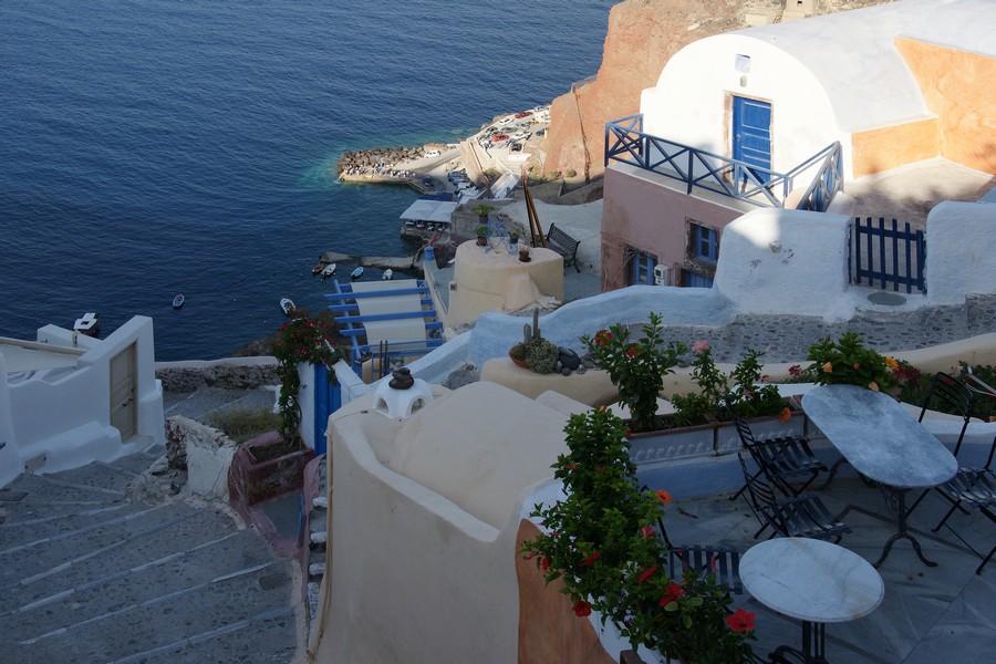 Wir sind glücklicherweise wieder die ersten, die mit dem Bus in Oía ankommen. Die Gassen sind noch leer, die Geschäfte werden gerade aufgesperrt, bevor der große Rummel losgeht. Ein kleiner Nachtel besteht, die Sonne steht noch tief, deswegen können wir erst mal nur in Richtung Westen fotografieren. Gebäude und Landschaft sind immer wieder faszinierend.