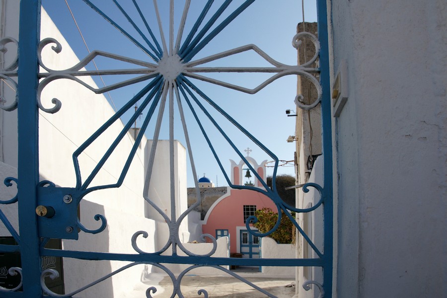 Wir sind glücklicherweise wieder die ersten, die mit dem Bus in Oía ankommen. Die Gassen sind noch leer, die Geschäfte werden gerade aufgesperrt, bevor der große Rummel losgeht. Ein kleiner Nachtel besteht, die Sonne steht noch tief, deswegen können wir erst mal nur in Richtung Westen fotografieren. Gebäude und Landschaft sind immer wieder faszinierend.