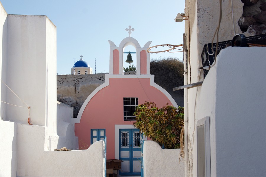 Wir sind glücklicherweise wieder die ersten, die mit dem Bus in Oía ankommen. Die Gassen sind noch leer, die Geschäfte werden gerade aufgesperrt, bevor der große Rummel losgeht. Ein kleiner Nachtel besteht, die Sonne steht noch tief, deswegen können wir erst mal nur in Richtung Westen fotografieren. Gebäude und Landschaft sind immer wieder faszinierend.