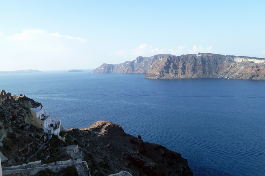 Wir sind glücklicherweise wieder die ersten, die mit dem Bus in Oía ankommen. Die Gassen sind noch leer, die Geschäfte werden gerade aufgesperrt, bevor der große Rummel losgeht. Ein kleiner Nachtel besteht, die Sonne steht noch tief, deswegen können wir erst mal nur in Richtung Westen fotografieren. Gebäude und Landschaft sind immer wieder faszinierend.