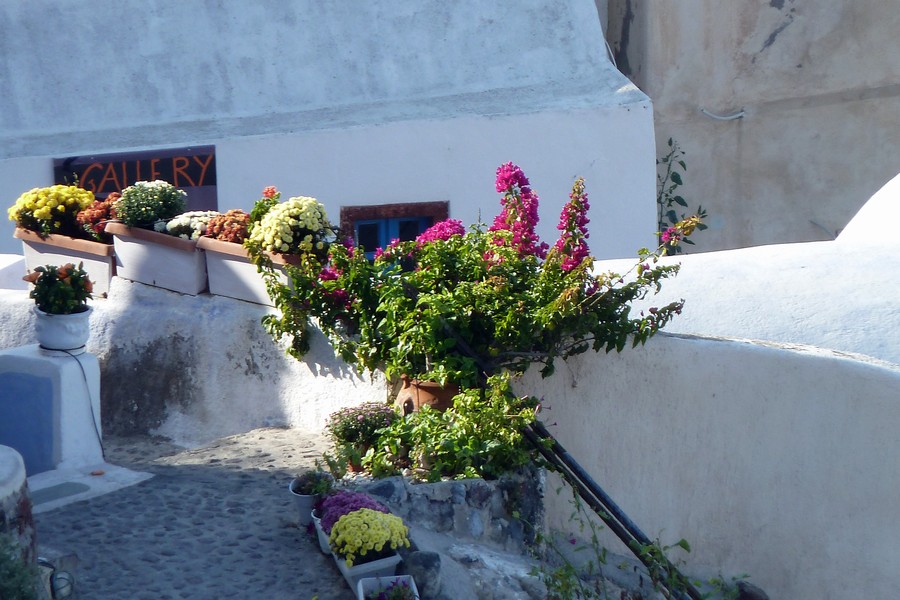Wir sind glücklicherweise wieder die ersten, die mit dem Bus in Oía ankommen. Die Gassen sind noch leer, die Geschäfte werden gerade aufgesperrt, bevor der große Rummel losgeht. Ein kleiner Nachtel besteht, die Sonne steht noch tief, deswegen können wir erst mal nur in Richtung Westen fotografieren. Gebäude und Landschaft sind immer wieder faszinierend.