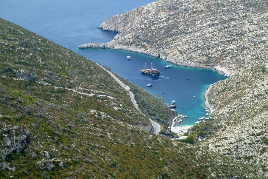 Wir genießen einen Tag das klare Wasser mit den einzigartigen Farben und Gesteinsformationen und fahren mit der Fähre inklusive Landrover nach Zakynthos, so verlieren wir keine Zeit. Zum Schiffswrack wollen wir. Es geht die ganze Südseite der Insel entlang, dann am Ende quer durch Zakynthos und zum Schluss die Berge hinunter zu einem kleinen Hafen. Jetzt gehts mit der Zakynthos zum Schiffswrack.