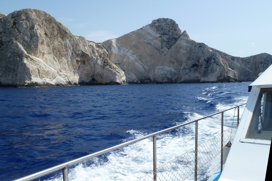 Wir genießen einen Tag das klare Wasser mit den einzigartigen Farben und Gesteinsformationen und fahren mit der Fähre inklusive Landrover nach Zakynthos, so verlieren wir keine Zeit. Zum Schiffswrack wollen wir. Es geht die ganze Südseite der Insel entlang, dann am Ende quer durch Zakynthos und zum Schluss die Berge hinunter zu einem kleinen Hafen. Jetzt gehts mit der Zakynthos zum Schiffswrack.
