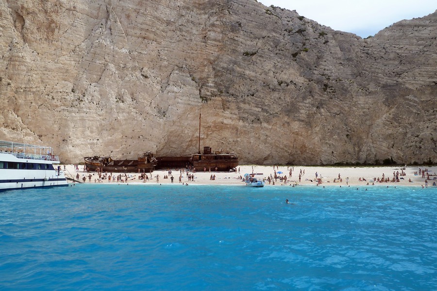 Wir genießen einen Tag das klare Wasser mit den einzigartigen Farben und Gesteinsformationen und fahren mit der Fähre inklusive Landrover nach Zakynthos, so verlieren wir keine Zeit. Zum Schiffswrack wollen wir. Es geht die ganze Südseite der Insel entlang, dann am Ende quer durch Zakynthos und zum Schluss die Berge hinunter zu einem kleinen Hafen. Jetzt gehts mit der Zakynthos zum Schiffswrack.