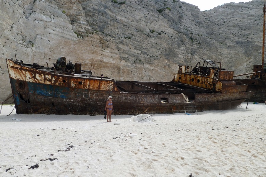 Wir genießen einen Tag das klare Wasser mit den einzigartigen Farben und Gesteinsformationen und fahren mit der Fähre inklusive Landrover nach Zakynthos, so verlieren wir keine Zeit. Zum Schiffswrack wollen wir. Es geht die ganze Südseite der Insel entlang, dann am Ende quer durch Zakynthos und zum Schluss die Berge hinunter zu einem kleinen Hafen. Jetzt gehts mit der Zakynthos zum Schiffswrack.
