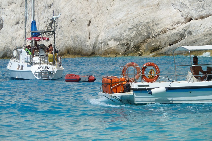 Wir genießen einen Tag das klare Wasser mit den einzigartigen Farben und Gesteinsformationen und fahren mit der Fähre inklusive Landrover nach Zakynthos, so verlieren wir keine Zeit. Zum Schiffswrack wollen wir. Es geht die ganze Südseite der Insel entlang, dann am Ende quer durch Zakynthos und zum Schluss die Berge hinunter zu einem kleinen Hafen. Jetzt gehts mit der Zakynthos zum Schiffswrack.