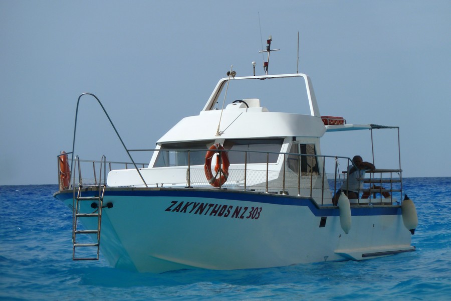 Wir genießen einen Tag das klare Wasser mit den einzigartigen Farben und Gesteinsformationen und fahren mit der Fähre inklusive Landrover nach Zakynthos, so verlieren wir keine Zeit. Zum Schiffswrack wollen wir. Es geht die ganze Südseite der Insel entlang, dann am Ende quer durch Zakynthos und zum Schluss die Berge hinunter zu einem kleinen Hafen. Jetzt gehts mit der Zakynthos zum Schiffswrack. |