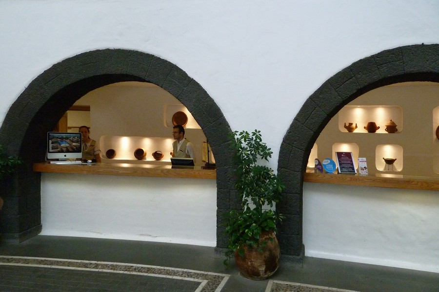 Diemal wohnen wir im 2001 erbauten Hotel Volcán, das architektonisch imposant als Dorf konzipiert wurde, aber inzwischen schon etwas renovierungsbedürftig ist. Wir kommen am Eingang durch eine Kirche mit Weihrauch in der Luft und gregorianischen Chorälen im Ohr, um dann anschließend im vulkanähnlichen Hauptgebäude im fünften Stock zur Rezeption zu gelangen. Der Empfang war perfekt, die Koffer wurden aus unserem PKW geholt und aufs Zimmer gebracht.