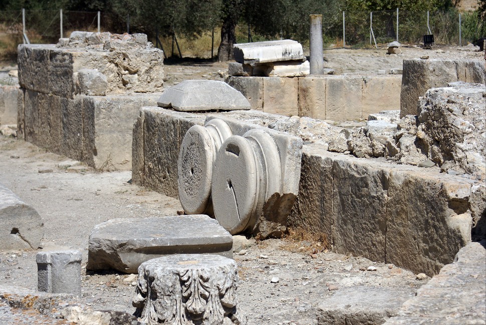 Direkt neben der Straße stehen die Überreste der Basilika Agios Titos. Die Kreuzkuppelkirche stammt aus dem 6. Jahrhundert nach Christus und wurde an der Stelle errichtet, wo früher die Kirche des heiligen Titus stand, der vom Apostel Paulus als erster Bischof Kretas eingesetzt wurde. Titos, ein Jünger des Paulus, begann von hier aus die Missionierung der Insel. Nördlich der Basilika befindet sich das Odeon, das Theater des späteren römischen Gortis. Erbaut im ersten Jahrhundert nach Christus und in teilweise erstaunlich gutem Zustand, beeindrucken vor allem der gut erhaltene Marmorfußboden im früheren Bühnenraum und die halbkreisförmig angeordneten Marmorsitzreihen.