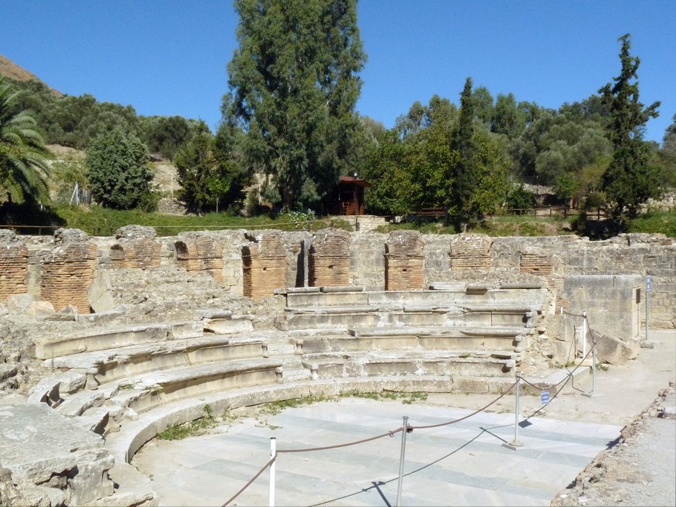 Direkt neben der Straße stehen die Überreste der Basilika Agios Titos. Die Kreuzkuppelkirche stammt aus dem 6. Jahrhundert nach Christus und wurde an der Stelle errichtet, wo früher die Kirche des heiligen Titus stand, der vom Apostel Paulus als erster Bischof Kretas eingesetzt wurde. Titos, ein Jünger des Paulus, begann von hier aus die Missionierung der Insel. Nördlich der Basilika befindet sich das Odeon, das Theater des späteren römischen Gortis. Erbaut im ersten Jahrhundert nach Christus und in teilweise erstaunlich gutem Zustand, beeindrucken vor allem der gut erhaltene Marmorfußboden im früheren Bühnenraum und die halbkreisförmig angeordneten Marmorsitzreihen.