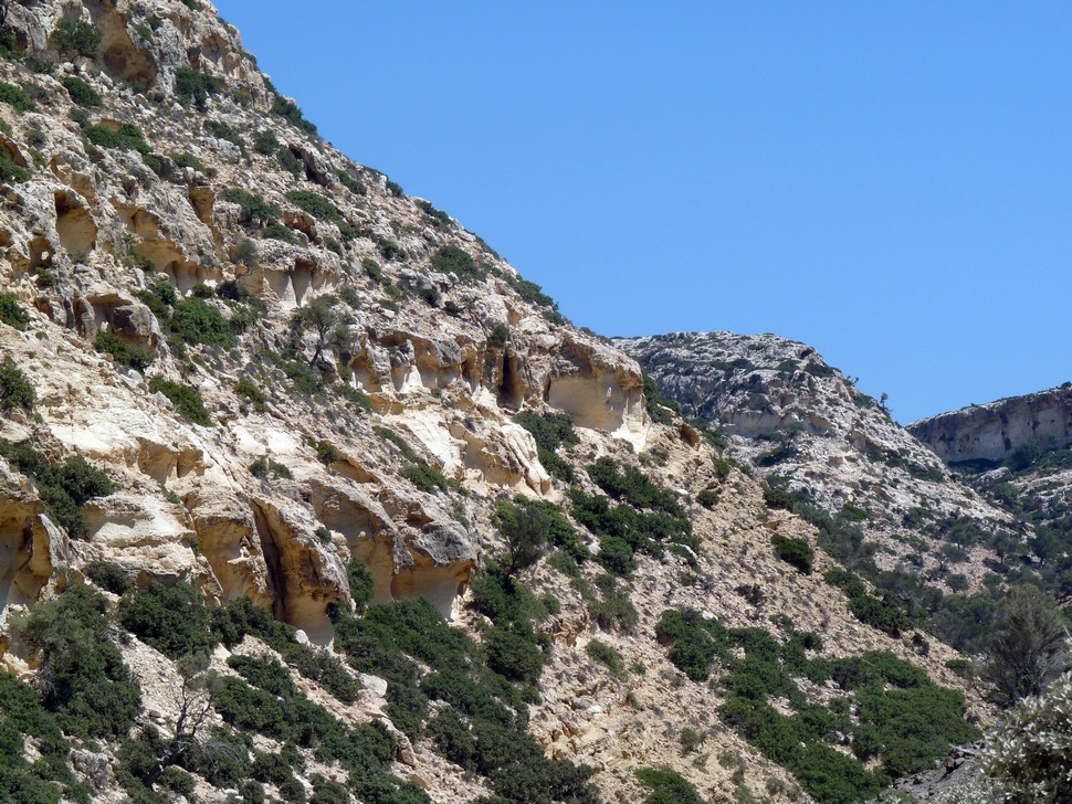 Heute fahren wir über Moni Odigitrias, wo wir den Mönchen eine CD mit unseren Bildern vom vergangenen Jahr übergeben und von denen wir wie jedes mal freundlich empfangen werden, auf Schotterstraßen vorbei an vielen Ziegen und Schafen Richtung Martsalo vorbei am Berg Kefali zur wunderschönen Bucht Vathi. Gewaltige Kreidefelsen säumen die Schotterstrasse.