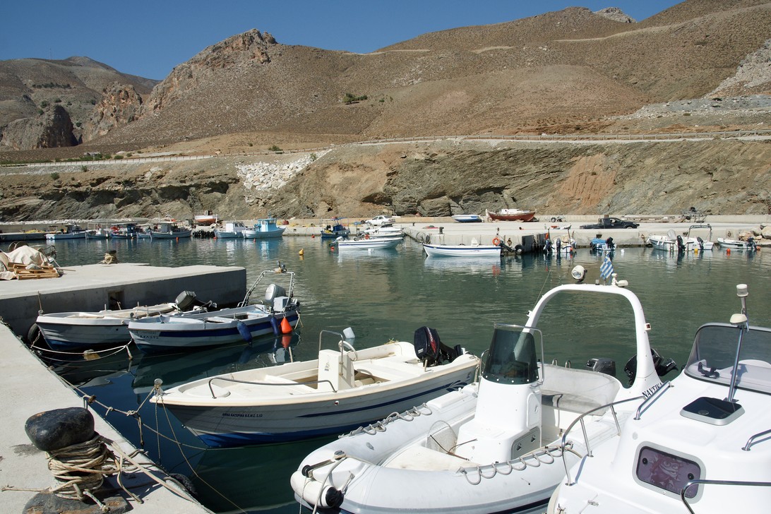 Auf Schotterstrassen geht es über das Asterousia-Gebige durch die wilde Schlucht an den Strand nach Tripiti, von dort weiter nach Lendas und nunmehr auf Asphaltstraßen zurück über Krotos, Miramu nach Kamilari.