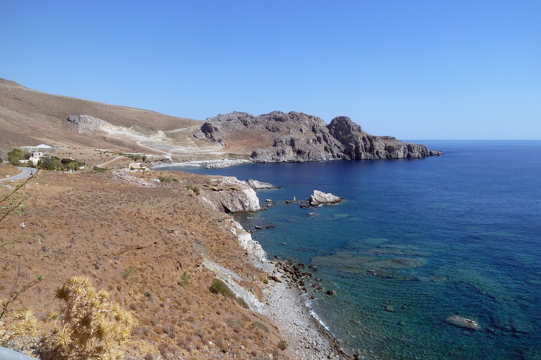 Auf Schotterstrassen geht es über das Asterousia-Gebige durch die wilde Schlucht an den Strand nach Tripiti, von dort weiter nach Lendas und nunmehr auf Asphaltstraßen zurück über Krotos, Miramu nach Kamilari.