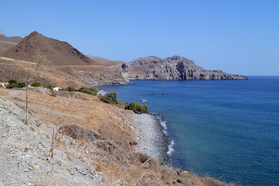 Auf Schotterstrassen geht es über das Asterousia-Gebige durch die wilde Schlucht an den Strand nach Tripiti, von dort weiter nach Lendas und nunmehr auf Asphaltstraßen zurück über Krotos, Miramu nach Kamilari.