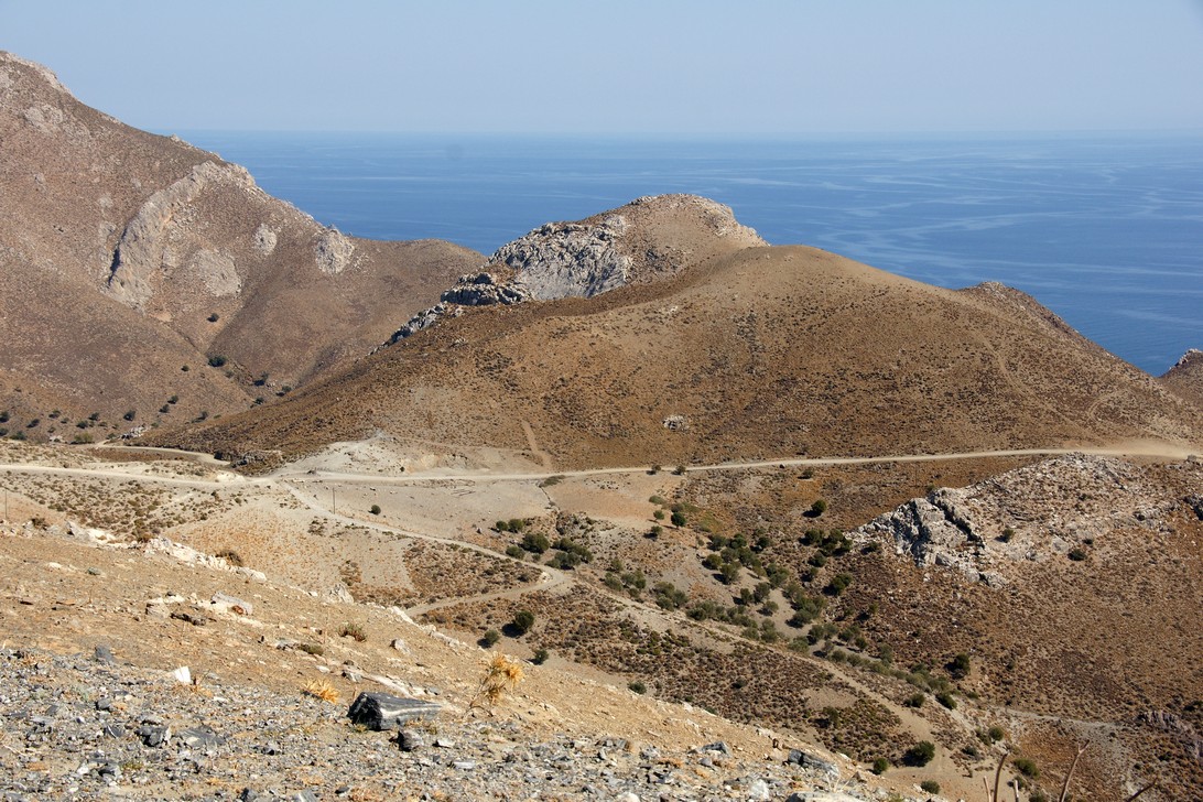 Auf Schotterstrassen geht es über das Asterousia-Gebige durch die wilde Schlucht an den Strand nach Tripiti, von dort weiter nach Lendas und nunmehr auf Asphaltstraßen zurück über Krotos, Miramu nach Kamilari.