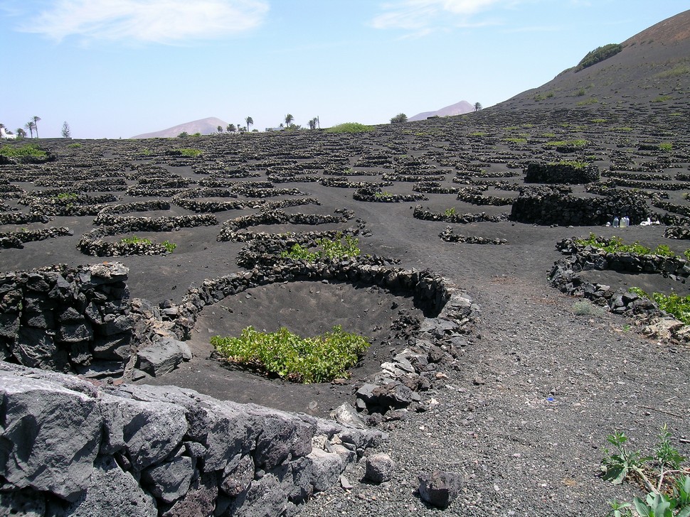 La Geria ist das große Weinanbaugebiet von Lanzarote. Der Wein wird auf spektakuläre Weise angebaut: Es werden kleine Mulden im dunklen, sandigen Vulkanboden ausgehoben. In jede Mulde wird ein Weinstock gepflanzt.