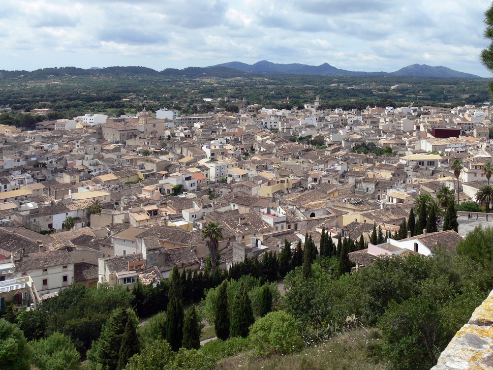 Aus der erhebt sich die Walfahrtskirche Sant Salvador, unterhalb sieht man die festungsähnliche Pfarrkirche.