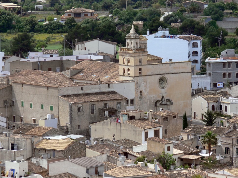 Aus der erhebt sich die Walfahrtskirche Sant Salvador, unterhalb sieht man die festungsähnliche Pfarrkirche.