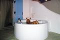 Unsere Suite und die ganze Anlage ist außergewöhnlich duchgestylt. Der Whirlpool auf dem großen Balkon ist etwas zu klein geraten. Naoussa,das hübsche Städtchen mit dem idyllischen, alten Fischerhafen versorgt uns kulinarisch.