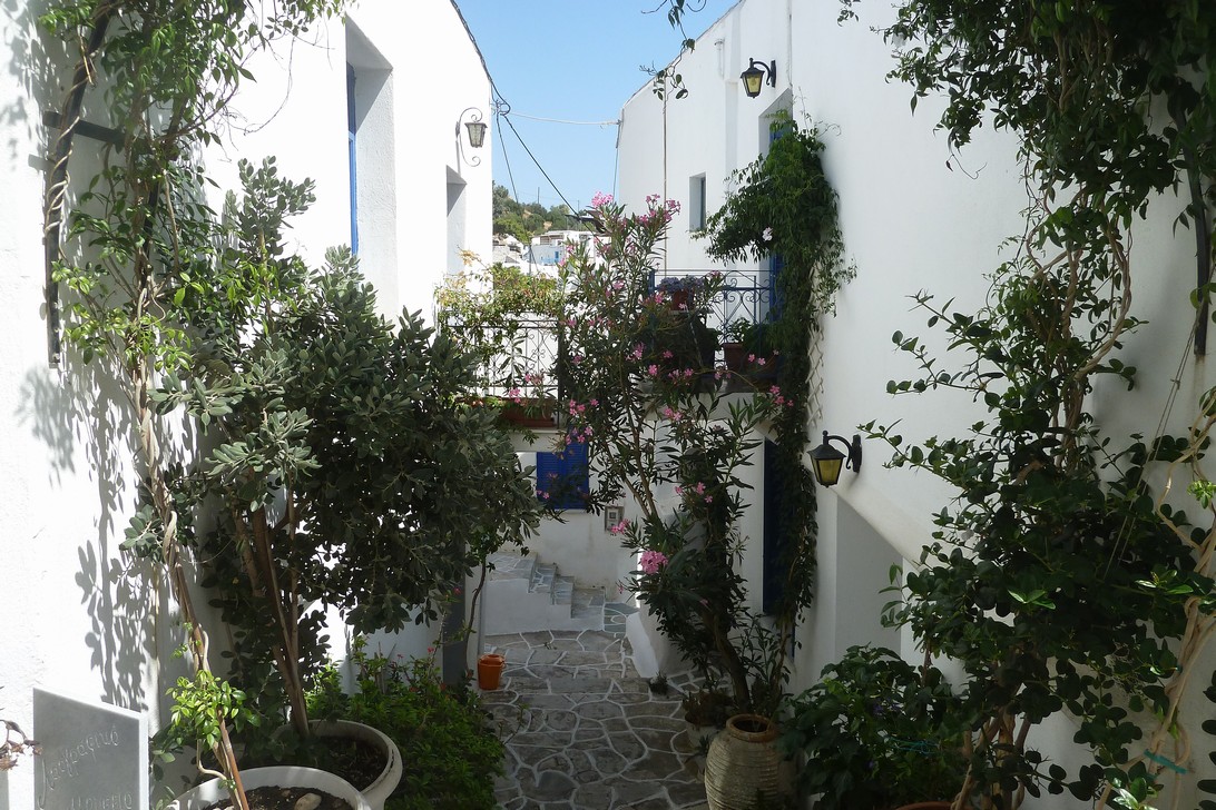Auf dem Weg nach Lefkes kommen wir zuerst nach Kóstos mit einer herzlichen Begrüßung am Ortseingang und einer besonders schönen Platía mit Taverne. Lefkes das größte Binnendorf liegt an einem Hang mit engen Gässchen und der Hauptkirche Agia Triáda, Während vor 5 Jahren der linke Kirchturm restauriert wurde, ist es diesmal der rechte.