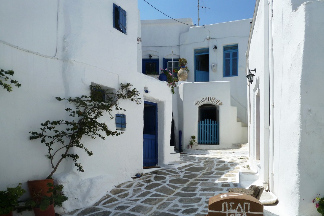 Auf dem Weg nach Lefkes kommen wir zuerst nach Kóstos mit einer herzlichen Begrüßung am Ortseingang und einer besonders schönen Platía mit Taverne. Lefkes das größte Binnendorf liegt an einem Hang mit engen Gässchen und der Hauptkirche Agia Triáda, Während vor 5 Jahren der linke Kirchturm restauriert wurde, ist es diesmal der rechte.