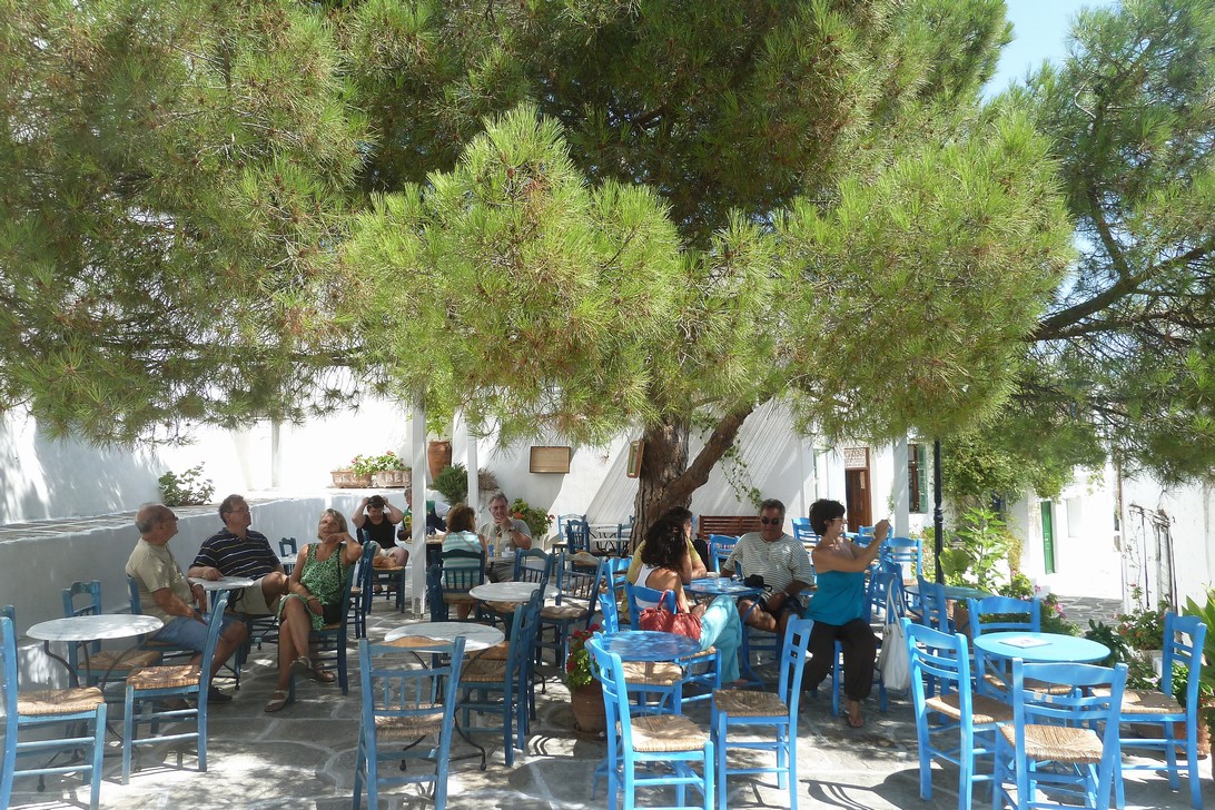 Auf dem Weg nach Lefkes kommen wir zuerst nach Kóstos mit einer herzlichen Begrüßung am Ortseingang und einer besonders schönen Platía mit Taverne. Lefkes das größte Binnendorf liegt an einem Hang mit engen Gässchen und der Hauptkirche Agia Triáda, Während vor 5 Jahren der linke Kirchturm restauriert wurde, ist es diesmal der rechte.