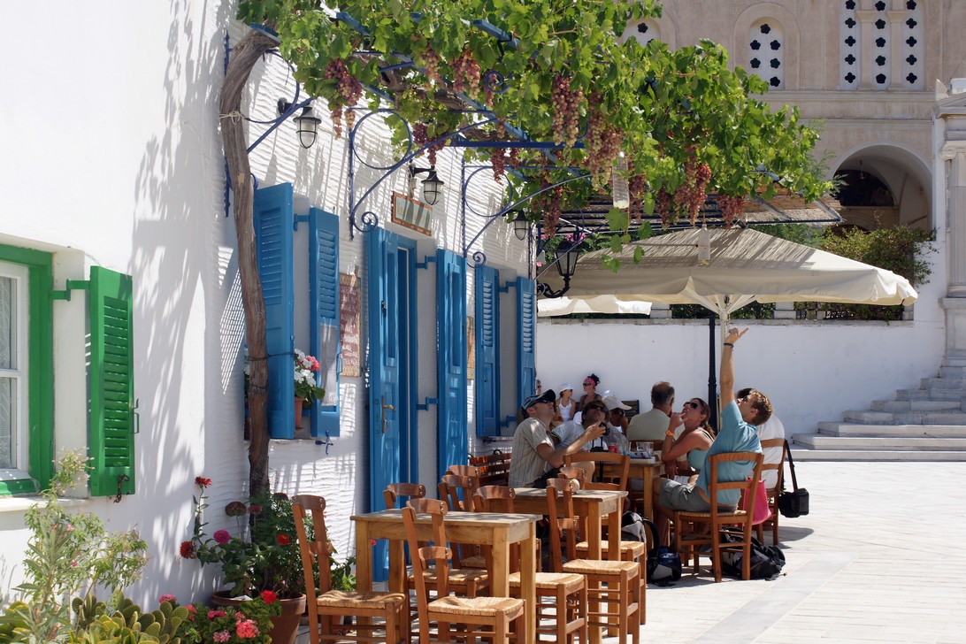 Auf dem Weg nach Lefkes kommen wir zuerst nach Kóstos mit einer herzlichen Begrüßung am Ortseingang und einer besonders schönen Platía mit Taverne. Lefkes das größte Binnendorf liegt an einem Hang mit engen Gässchen und der Hauptkirche Agia Triáda, Während vor 5 Jahren der linke Kirchturm restauriert wurde, ist es diesmal der rechte.