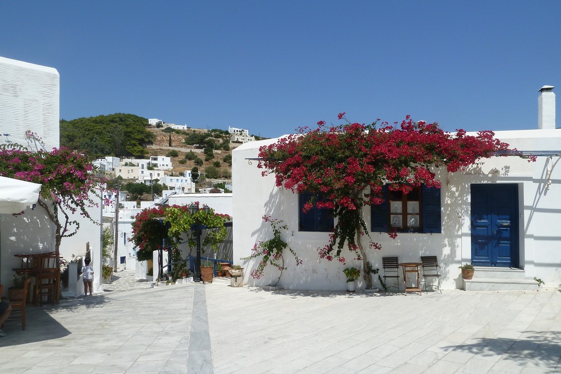 Auf dem Weg nach Lefkes kommen wir zuerst nach Kóstos mit einer herzlichen Begrüßung am Ortseingang und einer besonders schönen Platía mit Taverne. Lefkes das größte Binnendorf liegt an einem Hang mit engen Gässchen und der Hauptkirche Agia Triáda, Während vor 5 Jahren der linke Kirchturm restauriert wurde, ist es diesmal der rechte.