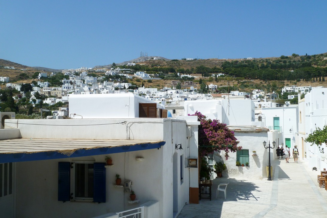 Auf dem Weg nach Lefkes kommen wir zuerst nach Kóstos mit einer herzlichen Begrüßung am Ortseingang und einer besonders schönen Platía mit Taverne. Lefkes das größte Binnendorf liegt an einem Hang mit engen Gässchen und der Hauptkirche Agia Triáda, Während vor 5 Jahren der linke Kirchturm restauriert wurde, ist es diesmal der rechte.