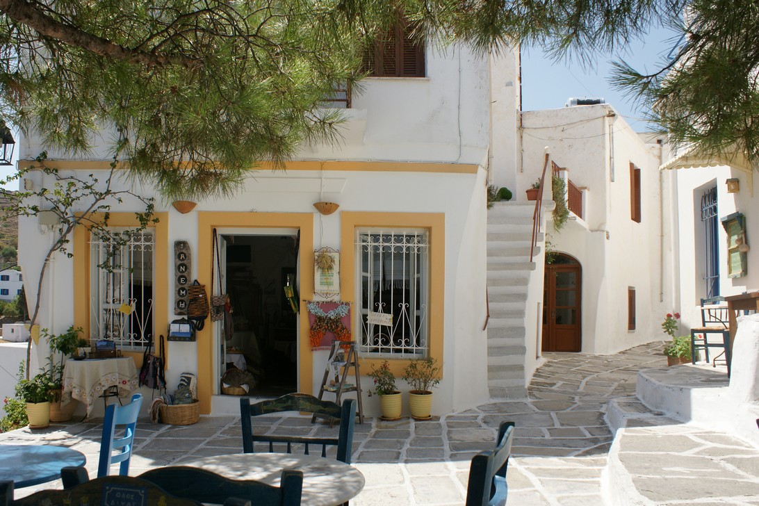Auf dem Weg nach Lefkes kommen wir zuerst nach Kóstos mit einer herzlichen Begrüßung am Ortseingang und einer besonders schönen Platía mit Taverne. Lefkes das größte Binnendorf liegt an einem Hang mit engen Gässchen und der Hauptkirche Agia Triáda, Während vor 5 Jahren der linke Kirchturm restauriert wurde, ist es diesmal der rechte.