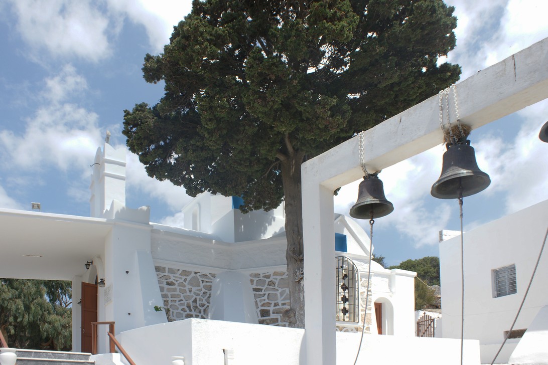 Wir fahren Richtung Flughafen und biegen vorher ab nach Petaloúdes, mit schöner Aussicht auf Antipáros und besuchen das Schmetterlingstal. Anschließend machen wir Halt beim Kloster Moni Christoú Dásous mit einer großen neuen gegenüber liegenden Kirche, die ausschließlich durch Spenden finanziert wird.