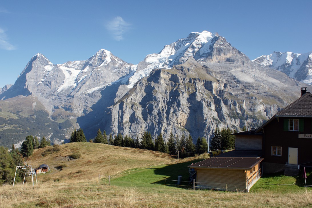Wir checken kurz im Eiger-Guesthause ein und gleich gehts weiter mit der Zahnradbahn auf die Alm zur Jause. Dort hat man noch einen besseren Ausblick von über 1900m auf die Gipfel.