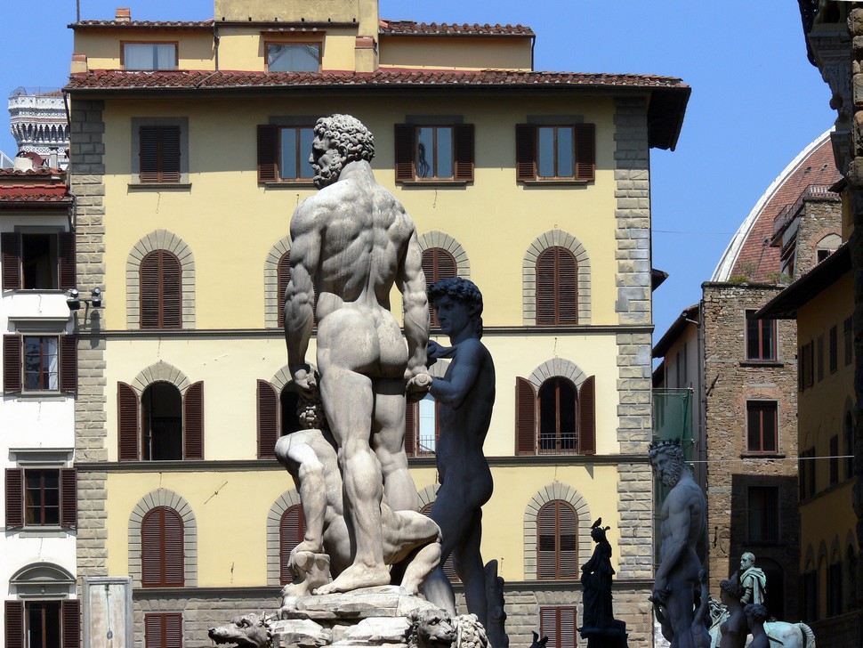 Wir lassen uns zum Piazzale Michelangelo führen, um denn herrlichen Ausblick auf die ganze Stadt zu genießen, ehe wir uns durch die Menschenmassen uber den Ponte Vecchio quälen. Wir kommen vorbei an den Uffizien, davor riesige Menschenschlangen, die Eintrittakarten kaufen wollen, weiter gehts zum Neptunbrunnen ehe wir dann an unserem Ziel, dem Dom, ankommen.