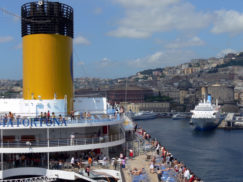 Unser Kreuzfahrtschiff diesmal die Costa Fortuna hat eine Länge von 273m und eine Breite von 36m. Sie besteht aus 17 Decks, davon sind 13 Gästedecks, und fährt maximal 24 Knoten. 3 große Bordrestaurants versorgen 3000 Passagiere. 11 Bars mit Livemusik, sowie Casino, Theater, Internetcafé und 1.300 qm Fitnessbereich lassen keine Langeweile aufkommen. Wir trafen in der Zigarren-und Cognac-Bar den Comandante Anelito Montesarchio und machten daraus gleich einen Fototermin.