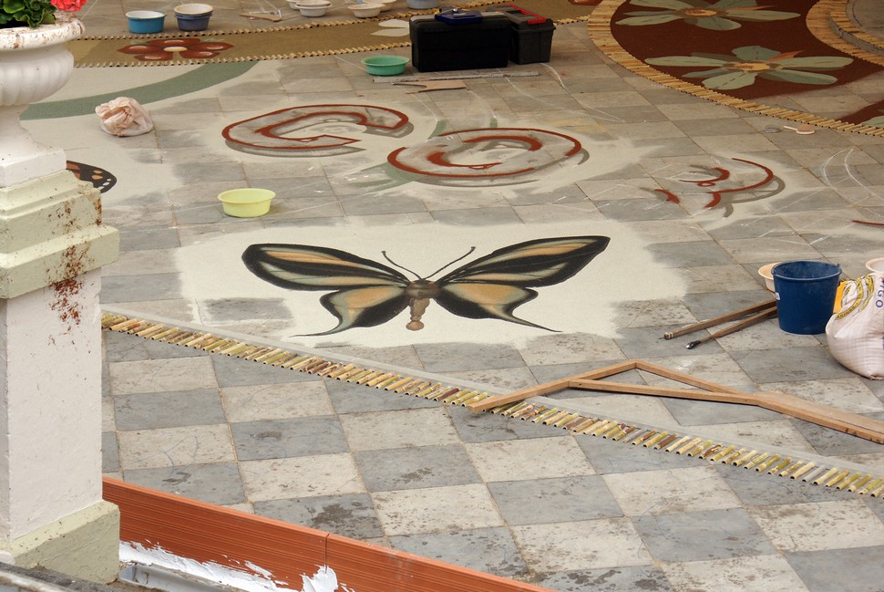 Aber auch auf dem Weg dahin müeeten wir uns durch Pasatwolken kämpfen. dDe Plaza steht im Mittelpunkt des Lebens in La Orotava. Vor Fronleichnam gestalten ortsansässige Künstler aus feingemahlenem vielfarbigen Vulkangestein aus den Canadas einen farbenfrohen Bilderteppich. Mit viel Phantasie und Können werden Szenen aus dem Testament umrahmt von bunten Blüten, Schmetterlingen und Mustern dargestellt.