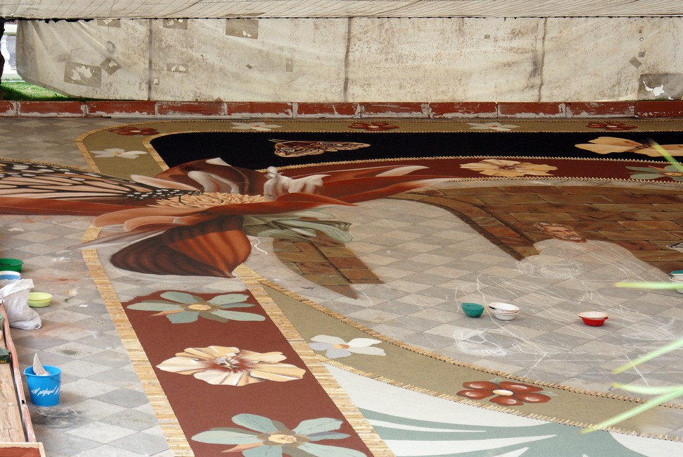 Aber auch auf dem Weg dahin müeeten wir uns durch Pasatwolken kämpfen. dDe Plaza steht im Mittelpunkt des Lebens in La Orotava. Vor Fronleichnam gestalten ortsansässige Künstler aus feingemahlenem vielfarbigen Vulkangestein aus den Canadas einen farbenfrohen Bilderteppich. Mit viel Phantasie und Können werden Szenen aus dem Testament umrahmt von bunten Blüten, Schmetterlingen und Mustern dargestellt.