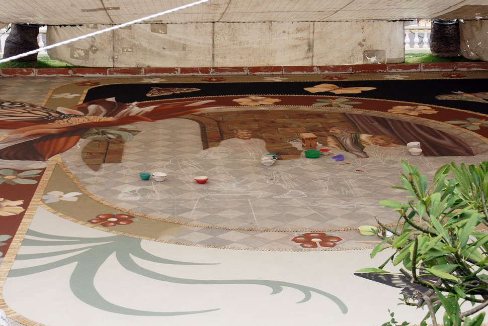 Aber auch auf dem Weg dahin müeeten wir uns durch Pasatwolken kämpfen. dDe Plaza steht im Mittelpunkt des Lebens in La Orotava. Vor Fronleichnam gestalten ortsansässige Künstler aus feingemahlenem vielfarbigen Vulkangestein aus den Canadas einen farbenfrohen Bilderteppich. Mit viel Phantasie und Können werden Szenen aus dem Testament umrahmt von bunten Blüten, Schmetterlingen und Mustern dargestellt.