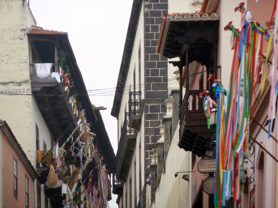 Aber auch auf dem Weg dahin müeeten wir uns durch Pasatwolken kämpfen. dDe Plaza steht im Mittelpunkt des Lebens in La Orotava. Vor Fronleichnam gestalten ortsansässige Künstler aus feingemahlenem vielfarbigen Vulkangestein aus den Canadas einen farbenfrohen Bilderteppich. Mit viel Phantasie und Können werden Szenen aus dem Testament umrahmt von bunten Blüten, Schmetterlingen und Mustern dargestellt.