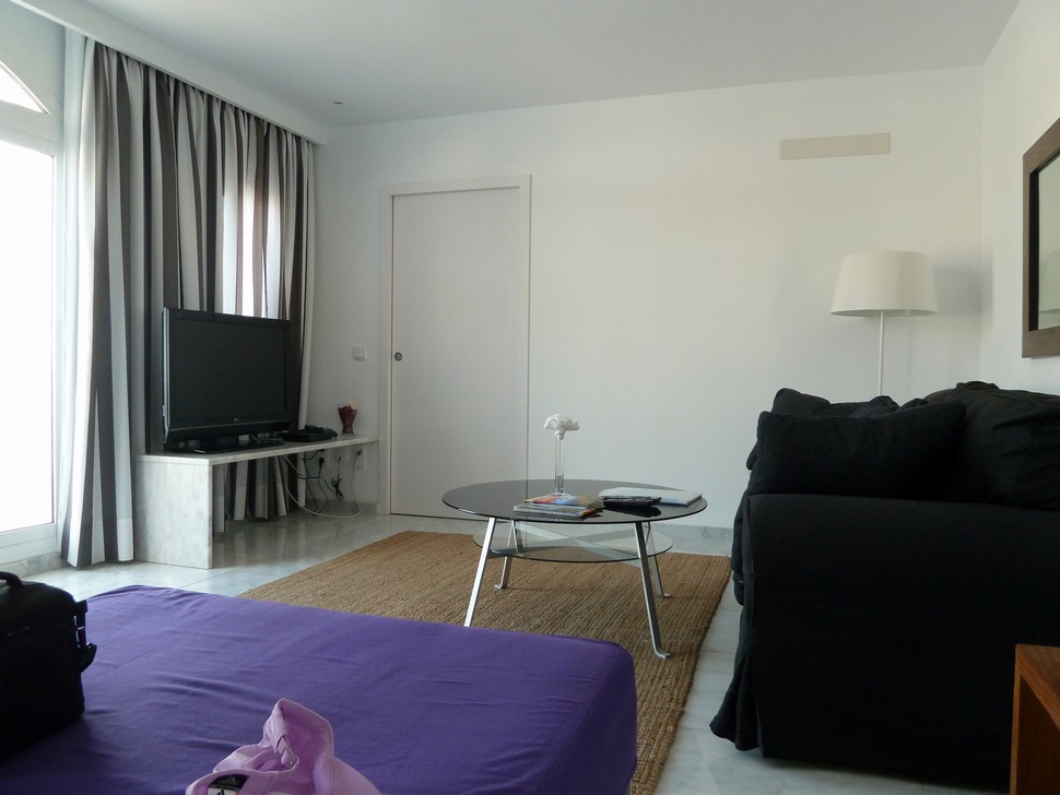 Wir wohnen in der einzigen Penthouse-Villa in einer 4-zeiligen 1km breiten Appartementanlage am Hang gebaut und sind begeistert vom Design der Villa, ganz in weiss und mit weißem Marmor gefliest.