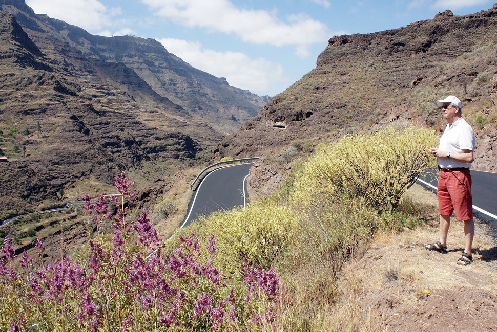 Unsere Fahrt geht über Mogán, wir bewundern die alte Windmühle, hinein in die grandiose Bergwelt, vorbei an Risco Grande über viele Serpentinen nach Ayacata, Vom beschriebenen Parkplatz wandern wir zum Roque Nublo. Über San Bartolomé geht es zurück nach Maspalomas in die Dünen.