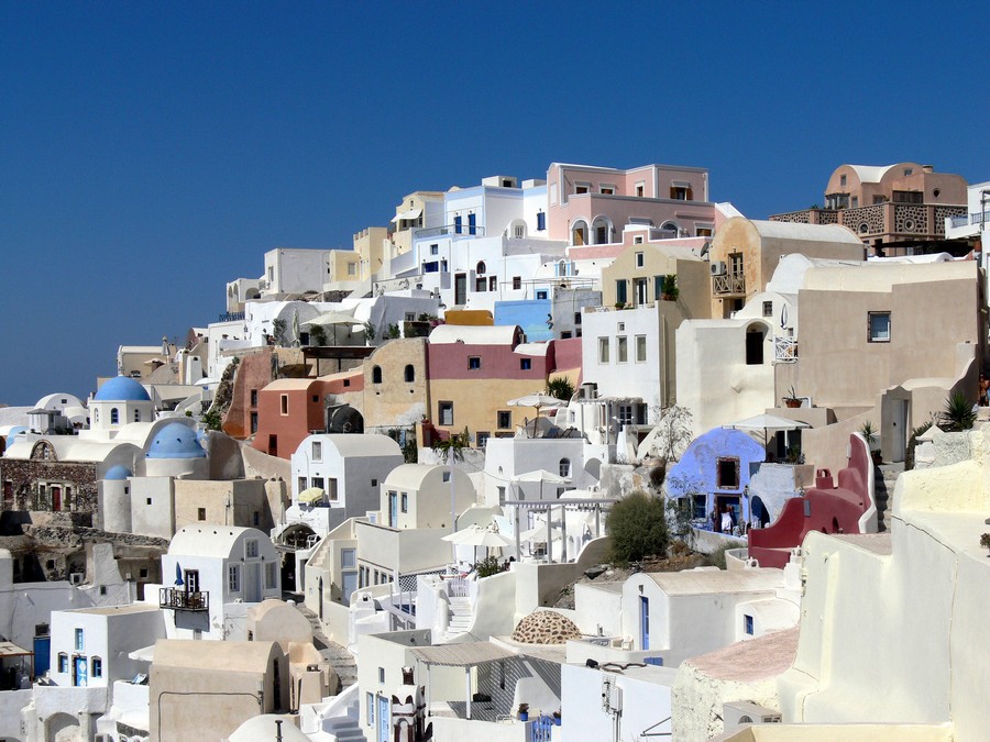 Oía ist wohl der spektakulärste Ort auf den Kykladen, an der Nordspitze Santorínis gelegen wurde er durch ein verheerendes Erdbeben 1956 total zerstört. Die Häuser und Kirchen hängen am Kraterrand, ein faszinierendes Labyrinth von Treppengässche, Kirchenkuppeln und dazwischen Höhlenwohnungen. So weltberühmt der Sonnenuntergang dort ist, herrscht jeden Abend ein Riesengedränge, denn jeder möchte den besten Ausblick haben.