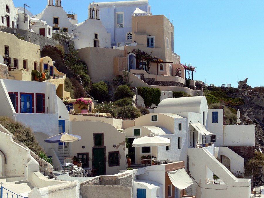 Oía ist wohl der spektakulärste Ort auf den Kykladen, an der Nordspitze Santorínis gelegen wurde er durch ein verheerendes Erdbeben 1956 total zerstört. Die Häuser und Kirchen hängen am Kraterrand, ein faszinierendes Labyrinth von Treppengässche, Kirchenkuppeln und dazwischen Höhlenwohnungen. So weltberühmt der Sonnenuntergang dort ist, herrscht jeden Abend ein Riesengedränge, denn jeder möchte den besten Ausblick haben.